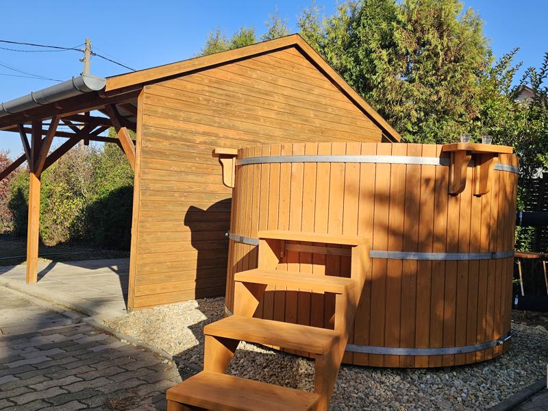 A tágas kert és a fedett terasz ideális helyszín a reggeli kávéhoz vagy az esti beszélgetésekhez. A kültéri sós vizű dézsafürdő egész évben különleges wellness élményt biztosít.